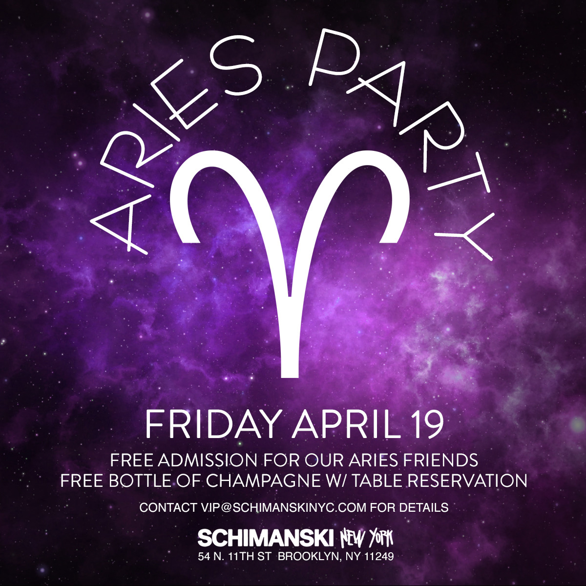 Aries Party Friday, April 19, 2019 4:00 PM 11:00 PM 16:00 23:00 Google Calendar ICS Friday April 19thRSVP HERE:Complimentary Entry until 2am: You & 4 friends!VIP Table: Ask about your complimentary bottle of champagne! Name * Name First Name Last Name Email * Birthday * Birthday MM DD YYYY Phone Number * Inquiry * Thank you!